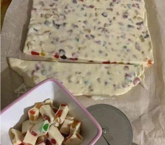 Découvrez les barres de nougat à quatre ingrédients : un délice moelleux et fondant, à la guimauve, garni de bonbons colorés et enrobé de chocolat blanc crémeux.