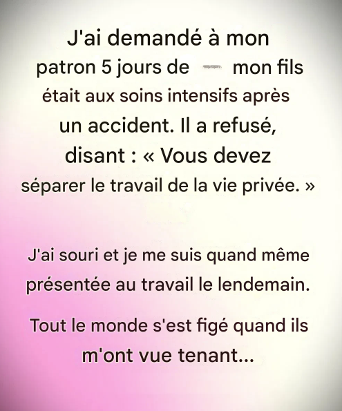 Mon fils avait été hospitalisé d'urgence suite à un accident soudain, et lorsque j'ai demandé cinq jours de congé à mon patron, il a refusé, me rappelant avec un détachement glaçant de « séparer vie professionnelle et vie personnelle ». J'aurais dû protester ou partir sur-le-champ. Mais l'épuisement peut révéler ce qui compte vraiment. Alors, le lendemain, je suis retournée au travail, non par obéissance, mais par une résolution intérieure.